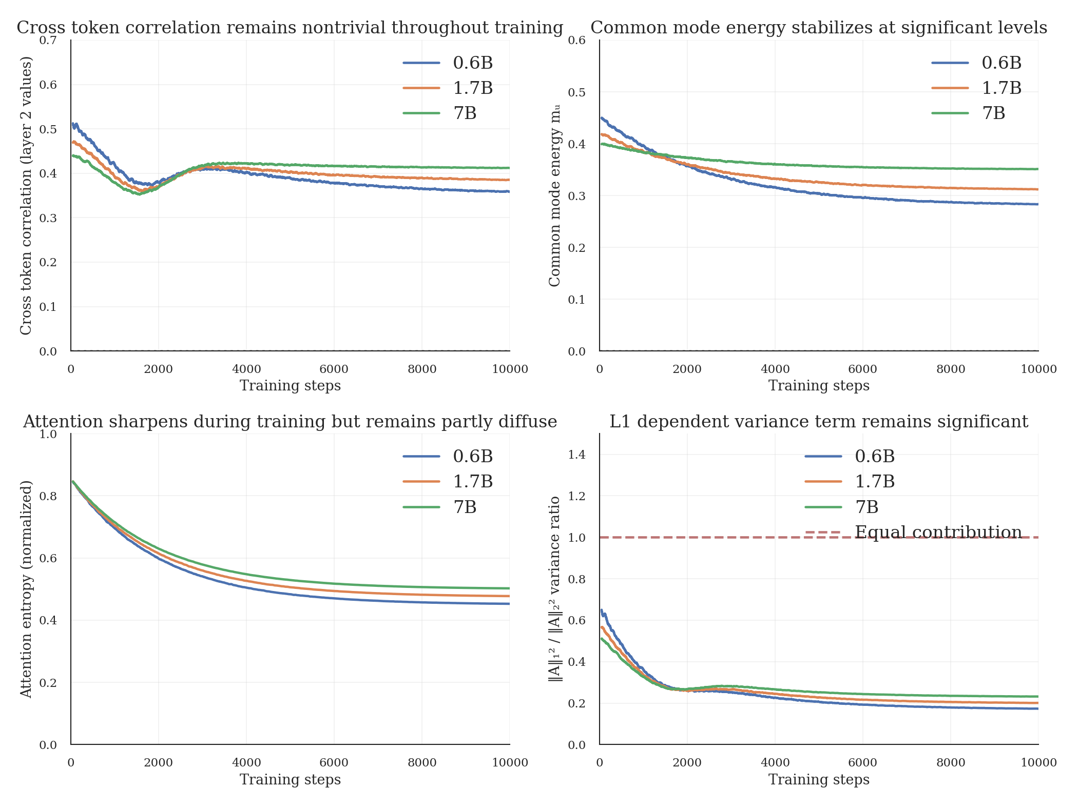 The previous section shows correlation exists at initialization. But does training eliminate it? We track training curves for three model scales (0.6B, 1.7B, 7B) trained on FineWeb over 10k steps.